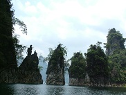ダムで堰き止められてできた広大な湖、ソック湖畔からロングテールボートに乗る。エメラルドグリーンの湖上をボートは波しぶきを立てて快走、次第に石灰岩の奇岩群に囲まれる。