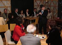 終了後に余韻に浸る交流の輪 宴の後半にはプレゼント抽選会を催した。景品には有田焼の小火鉢など豪華な焼き物類が用意された。これは参加者の女性の実家が有田の窯元で、この会のために譲っていただいたもの。また、女性全員には老舗和菓子店・芝榮太楼の和三盆がお土産に手渡された。